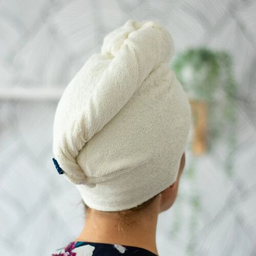 To create your hair turban, simply tip your head, place the hair wrap towel gently on your neck and twist your wet hair into the towel or if you have short hair twist the towel into a spiral. Flip the end of the hair wrap towel onto your head and secure at the back of your neck with the smart wooden button.